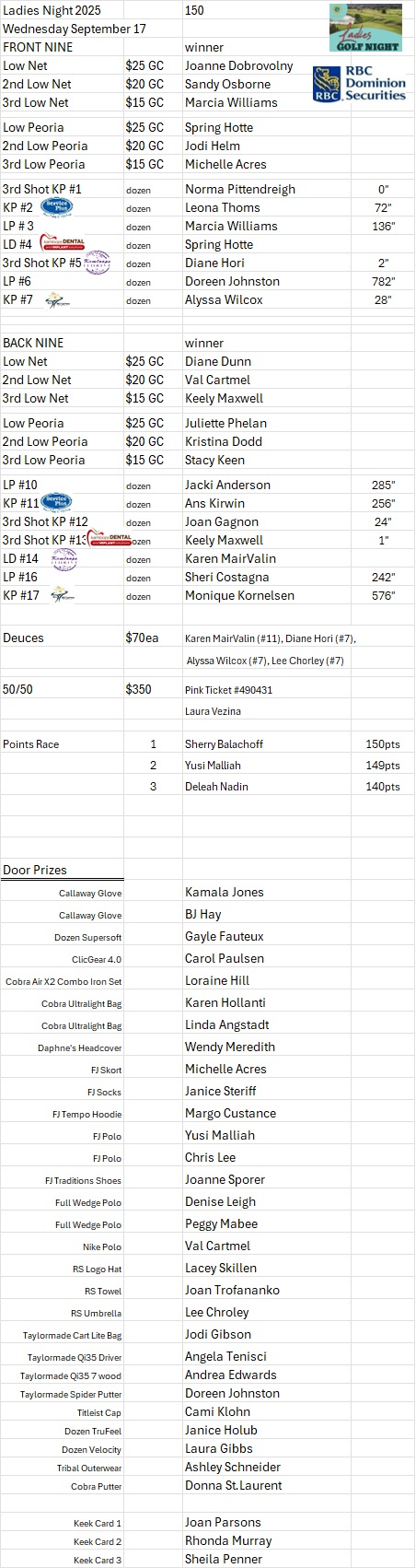 Prizes totaling over $7,100 were awarded last night. Unclaimed prizes are available for pick up in the pro shop.