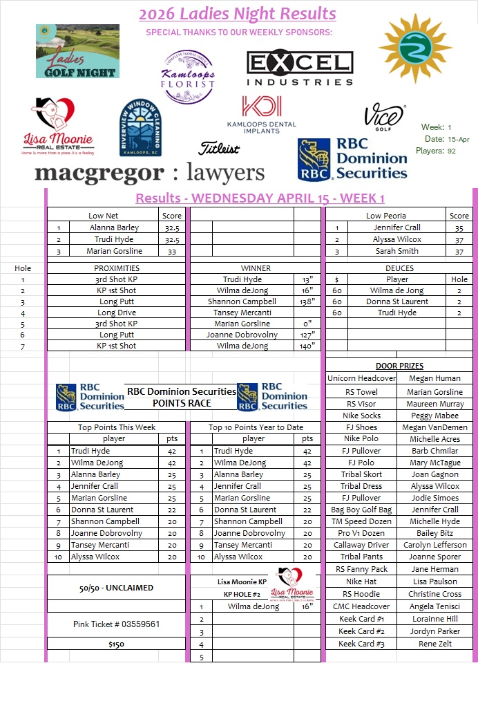 Prizes totaling over $3,100 were awarded last night. Unclaimed prizes are available for pick up in the pro shop.